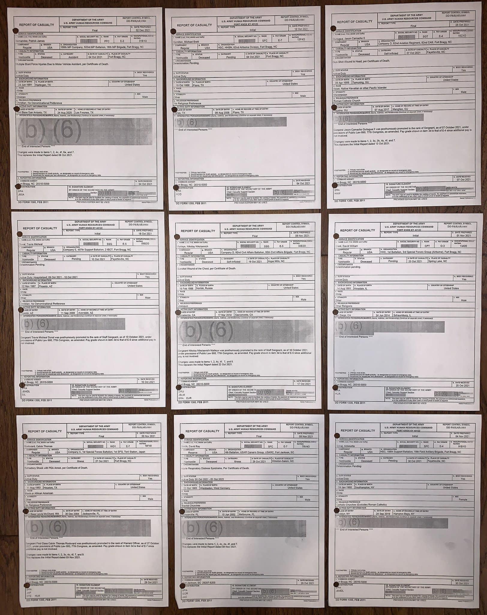 FOIA (Freedom of Information Act) Berichte über Verluste der US-Armee in Fort Bragg (North Carolina, einer der grössten Militärstützpunkte):