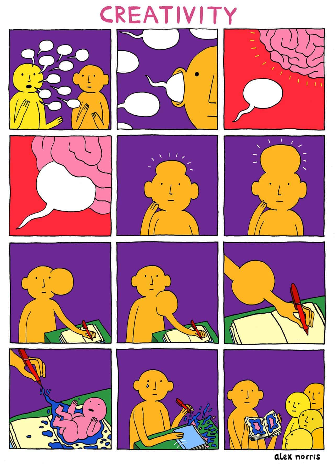 Der Comic behandelt noch einen Aspekt mehr als nur die Entstehung von Kreativität: Beim Versuch, seinen kreativen Gedanken auszudrücken, geht oft viel zu viel der Idee verloren. Sprich Buch matscht Kind kaputt…