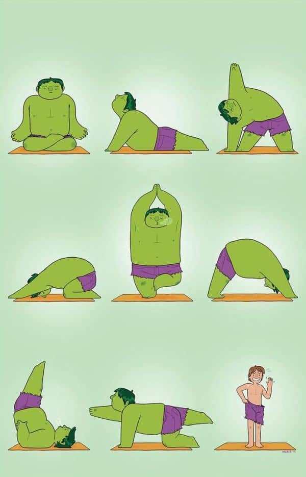 Freunde, bestimmt habt ihr euch auch schon gefragt, was Hulk eigentlich macht, um wieder zu Bruce Banner zu werden? Die Antwort ist ganz einfach: Natürlich Yoga! Den Yoga ist gut, um seine innere Ruhe zu finden, was sicherlich für Hulk sehr sinnvoll ist. Der Comic hier stammt von Maris Wicks, welche auch noch weitere Zeichnungen mit anderen Superheldensportarten gemacht hat…