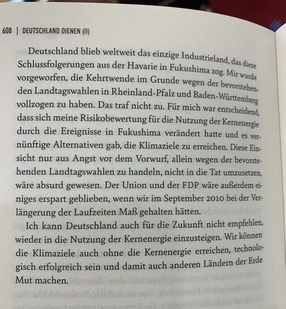 - Befremdlich fand ich es, in Angela Merkels Autobiografie die Seiten zu lesen über den Atomausstieg. Trotz der Tragweite der Entscheidung gab es nach der Tsunami-Katastrophe in Japan demnach kaum Debatten innerhalb der Regierung. Dazu kam dann noch jene groteske Empfehlung der skurrilen Ethikkommission mit all ihren Laien ohne einen Energie-Experten im Gremium. Merkel steht weiterhin zum Atomausstieg, um «anderen Ländern Mut zu machen». Na, dann. Hier die letzte Passage des Kapitels: