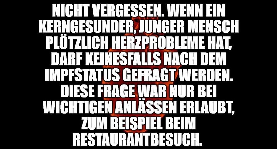 Nicht vergessen. Wenn ein kerngesunder, junger Mensch plötzlich Herzprobleme hat, darf keinesfalls nach dem Impfstatus gefragt werden.
