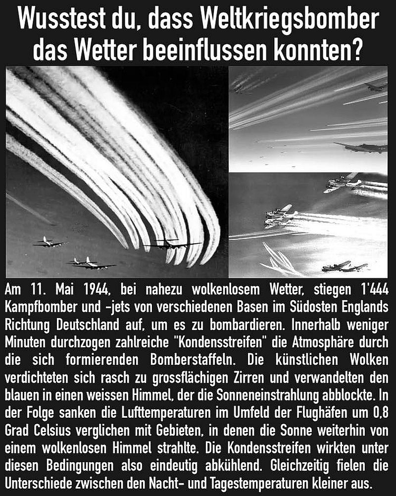 Am 11. Mai 1944, bei nahezu wolkenlosem Wetter, stiegen 1444 Kampfbomber und -jets von verschiedenen Basen im Südosten Englands Richtung Deutschland auf, um es zu bombardieren. Innerhalb weniger Minuten durchzogen zahlreiche «Kondensstreifen» die Atmosphäre durch die sich formierenden Bomberstaffeln. Die künstlichen Wolken verdichteten sich rasch zu grossflächigen Zirren und verwandelten den blauen in einen weissen Himmel, der die Sonneneinstrahlung abblockte. In der Folge sanken die Lufttemperaturen im Umfeld der Flughäfen um 0,8 Grad Celsius verglichen mit Gebieten, in denen die Sonne weiterhin von einem wolkenlosen Himmel strahlte. Die Kondensstreifen wirkten unter diesen Bedingungen also eindeutig abkühlend. Gleichzeitig fielen die Unterschiede zwischen den Nacht- und Tagestemperaturen kleiner aus.