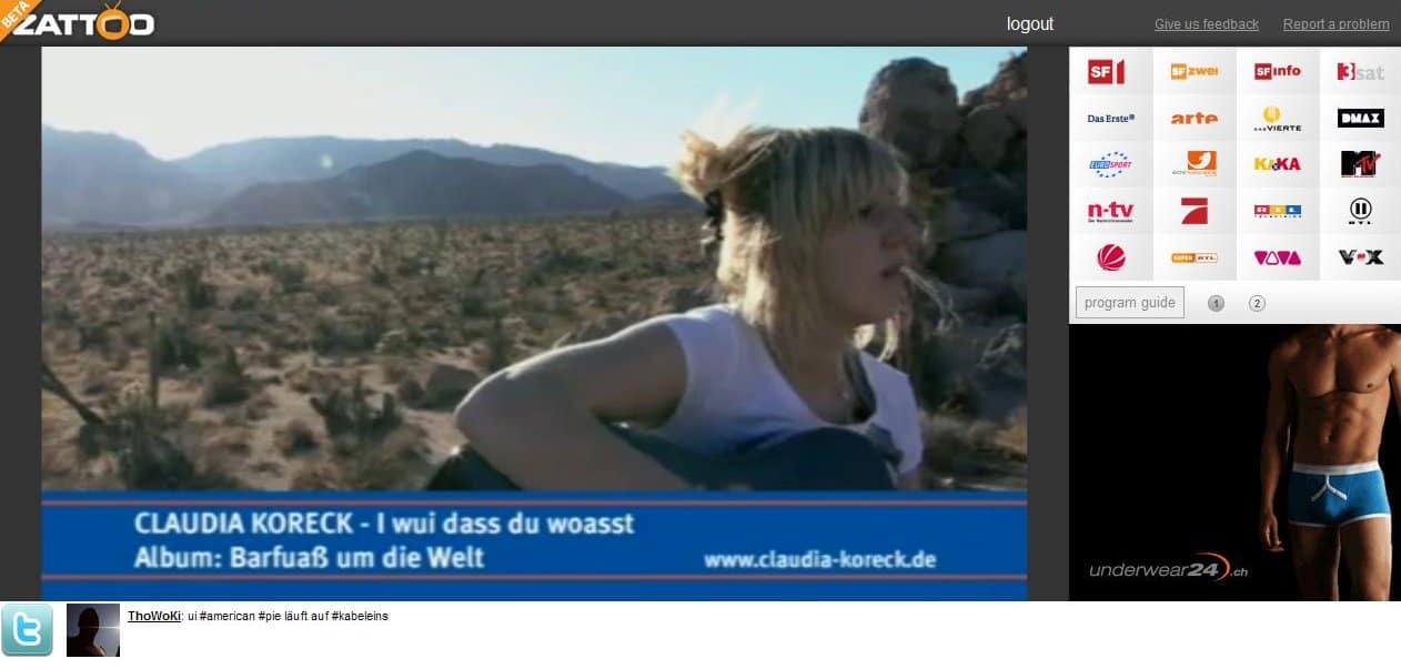 Seit einiger Zeit darf ich die Browser Version von Zattoo testen. Und was soll ich sagen, Zattoo ist stylischer und funktioneller als Wilmaa, bietet 10 Sender mehr, eine deutlich bessere Tonqualität und der Programmquide zum Durchstöbern der Sender fehlt auch nicht. Jetzt wurde auch Twitter integriert.