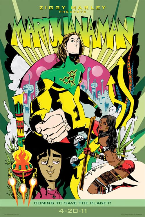 Ziggy Marley hatte seinen Marijuanaman bereits im Sommer auf der ComicCon angekündigt, im April ist es jetzt soweit und das Teil erscheint bei Image Comics. Das Cover überzeugt mich nicht wirklich, daür gefällt mir das nachfolgende Poster. Im Comic von Ziggy Marley gehts um Marijuanaman, der von einem Planeten stammt, der «is in desperate need of THC. Marijuanaman seeks to save Earth’s marijuana fields from destruction by the drug company PharmeXon, and thus saving his home planet from destruction.» Must Have!