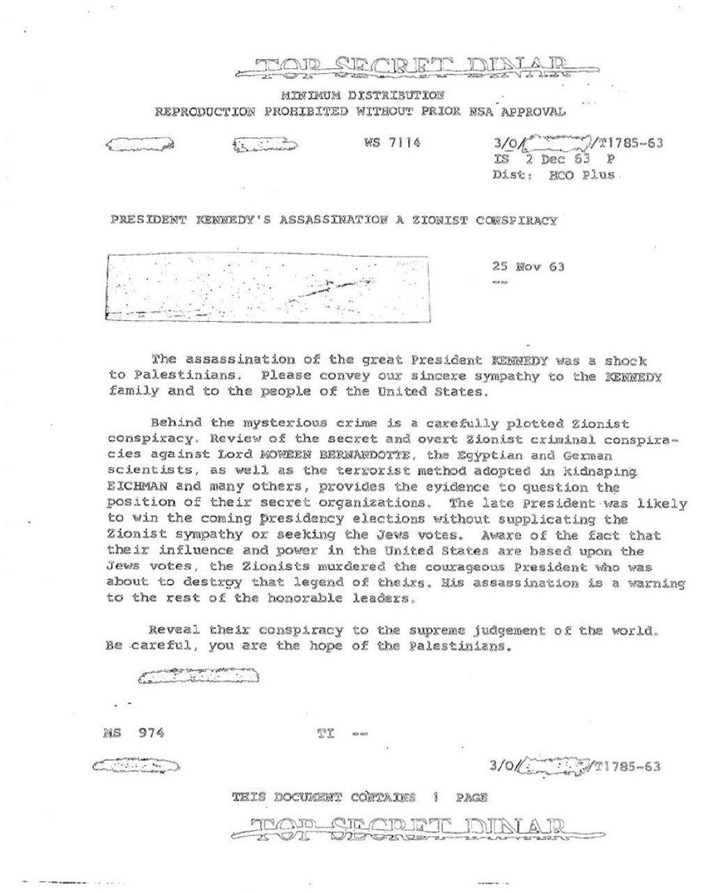 Ein kürzlich freigegebenes NSA-Dokument macht «zionistische Verschwörung» für die Ermordung von Präsident John F. Kennedy verantwortlich.