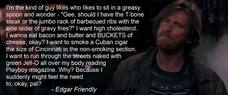 Edgar Friendly, fiktiver Charakter aus dem Film «Demolition Man»You see, according to Cocteau’s plan I’m the enemy, ‚cause I like to think; I like to read. I’m into freedom of speech and freedom of choice. I’m the kind of guy likes to sit in a greasy spoon and wonder – «Gee, should I have the T-bone steak or the jumbo rack of barbecued ribs with the side order of gravy fries?» I WANT high cholesterol. I wanna eat bacon and butter and BUCKETS of cheese, okay? I want to smoke Cuban cigar the size of Cincinnati in the non-smoking section. I want to run through the streets naked with green jello all over my body reading playboy magazine. Why? Because I suddenly might feel the need to, okay, pal?