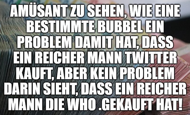 Amüsant zu sehen, wie eine bestimmte Bubbel ein Problem damit hat, dass ein reicher Mann Twitter kauft, aber kein Problem darin sieht, dass ein reicher Mann die WHO gekauft hat.