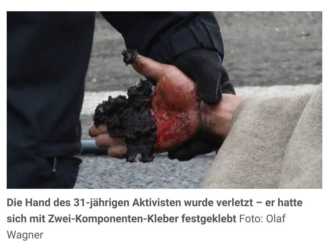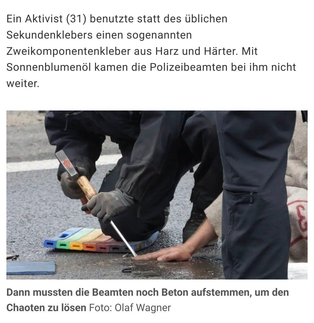 Richtige Klimaaktivisten spitzen den Strassenbelag weg, bis ein ca. 20 cm tiefes Loch entsteht, stecken ihre Hand da rein und verschliessen das Loch dann mit Schnellbinder-Zement oder -Beton. Alles andere sind halbe Sachen. Ein echter Aktivist nagelt sich an! Schliesslich geht es um die Existenz der Menschheit!